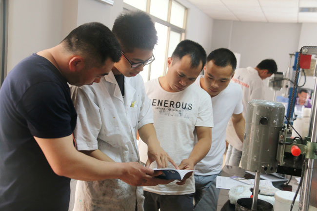 努力不分淡旺季,來自廣西生產(chǎn)乳膠漆的陳總慕名來到鑫浪交流700水包水、水包砂技術(shù)。陳總深知多彩時代帶來的機遇,錯過多彩將會錯過這個時代,這才不分周末、爭分奪秒的學(xué)習(xí)與探討,鑫浪也將24小時為我們所有700客戶服務(wù),做好他們的技術(shù)后盾。