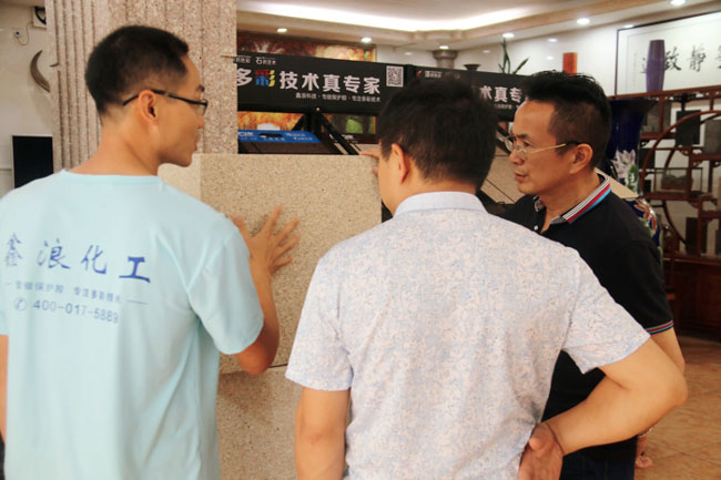 熱烈歡迎700合作伙伴——云南ETO大師漆宋總、陳工來鑫浪交流700水包水、水包砂技術(shù)。700多彩體系一個(gè)配方即可隨意調(diào)節(jié)粒子軟硬度等表現(xiàn)效果,不用更換原材料就可滿足不同甲方客戶的不同需求。宋總再次鑫浪之行,對(duì)于鑫浪技術(shù)的迭代能力與版面仿石效果給予高度認(rèn)可。ETO大師漆在當(dāng)?shù)貪B透力強(qiáng),再配合鑫浪完善的多彩服務(wù)體系,必將共同開創(chuàng)多彩新未來。