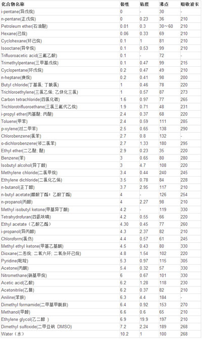 常用溶劑的極性順序:水(極性最大)>甲酰胺>乙腈>甲醇>乙醇>丙醇>丙酮>二氧六環(huán)>四氫呋喃>甲乙酮>正丁醇>醋酸乙酯>乙醚>異丙醚>二氯甲烷>氯仿>溴乙烷>苯>氯丙烷>甲苯>四氯化碳>二硫化碳>環(huán)己烷>己烷>庚烷>煤油(極性最小)