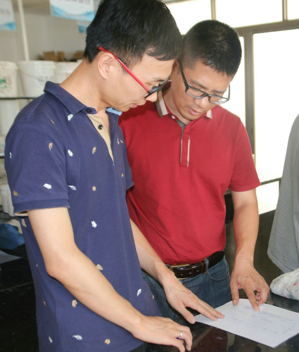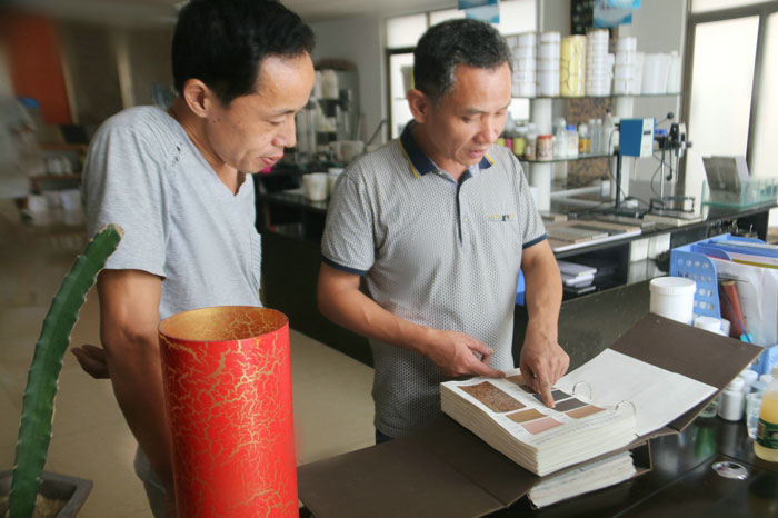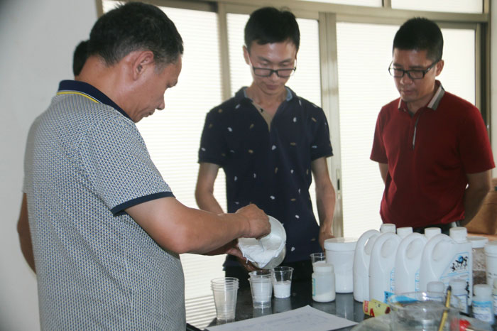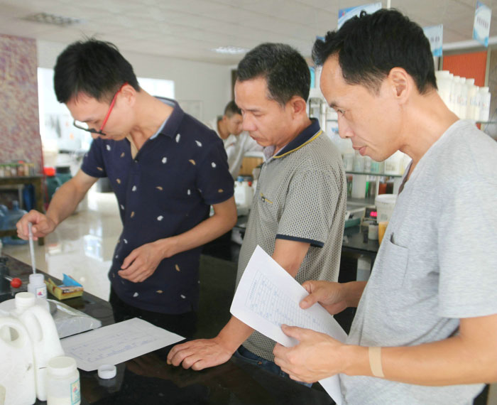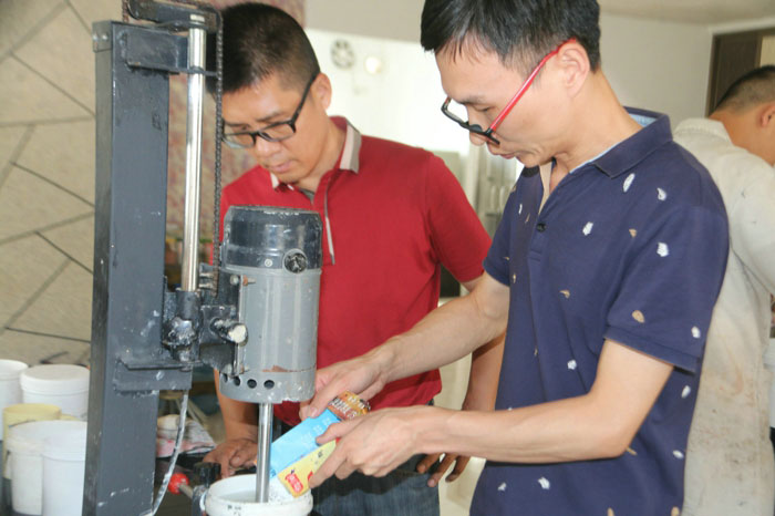 陶總、許工、陳工親自體驗700水包水多彩體系的生產(chǎn)與施工,并在顆粒兩小時表干后對樣板進行泡水,顆粒無發(fā)白、起皺的現(xiàn)象。 700給永固交了一份滿意的答卷!