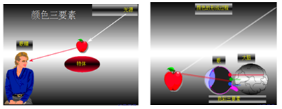 顏色的三個(gè)要素是:光源、物體、人眼(見下圖左)。